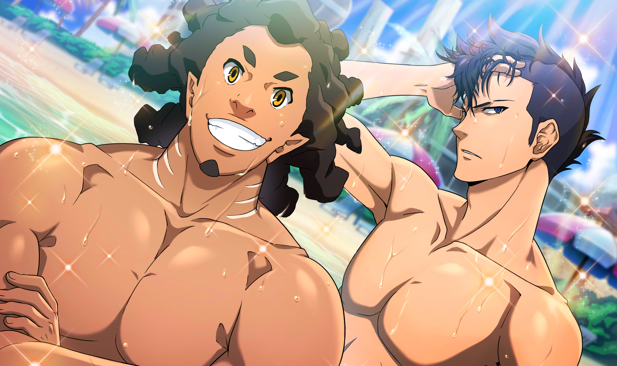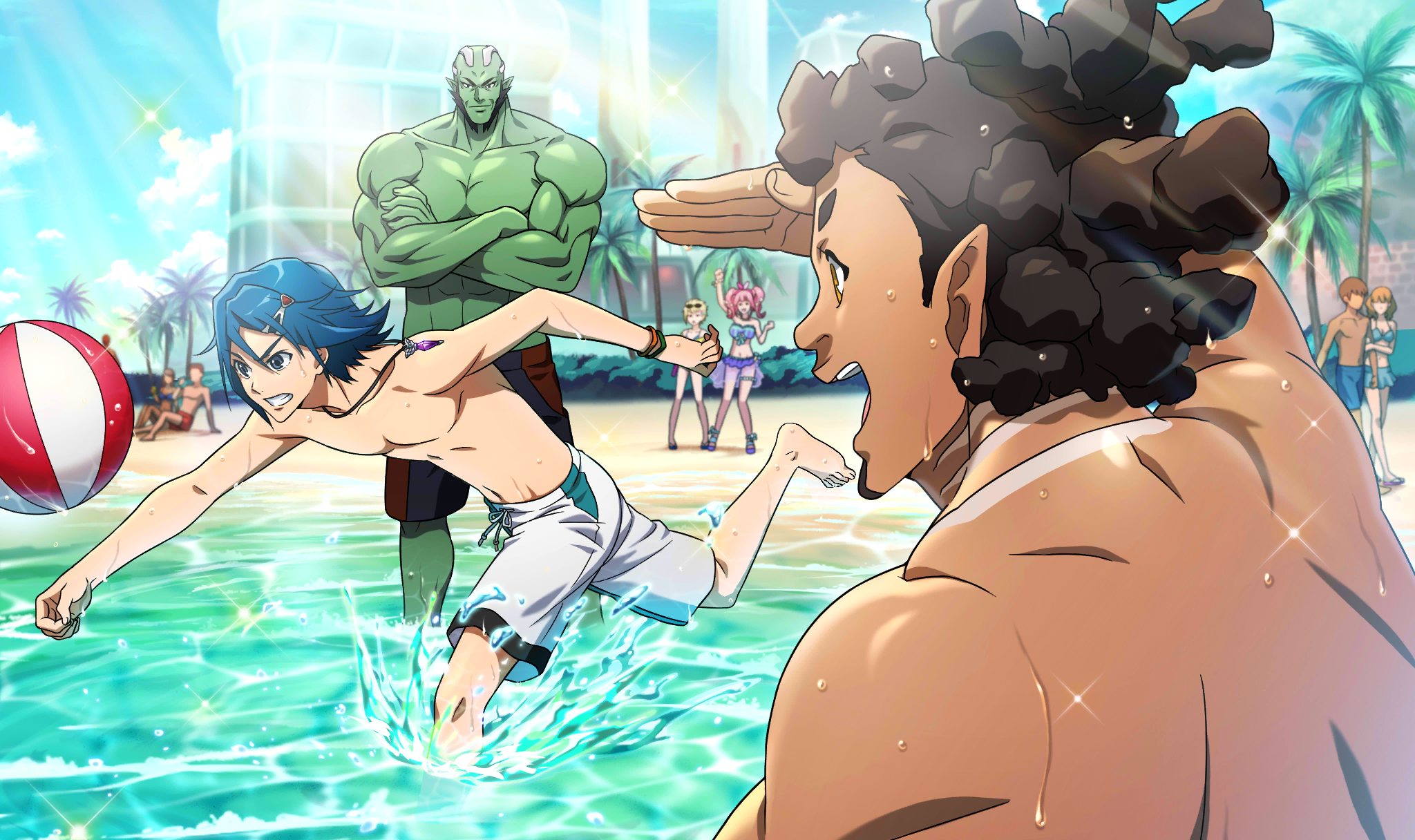 | Description | master sn_dsc_1105 | 女性陣に対抗して水着に着替えるパイロットたち。男だけで遊ぶ姿に華はないが、 普段は戦闘で忙しい小隊メンバーも、今回はオフを満喫しているようだ。 |